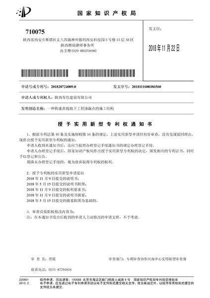 近日,由有色陜建申請的實用新型專利“一種快速查找地下工程滲漏點的施工結(jié)構(gòu)”被國家知識產(chǎn)權(quán)局授權(quán),專利號:201820724009.0。