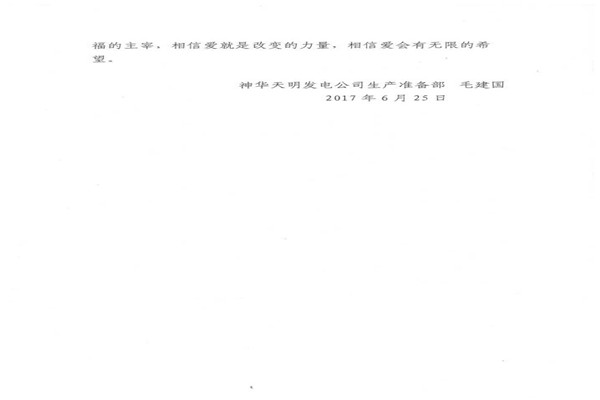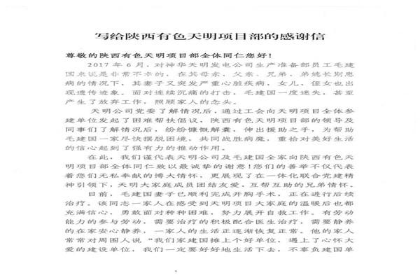 信中指出,神華天明發(fā)電公司員工毛建國家人長期患病,妻子又突發(fā)嚴(yán)重的心臟病,讓原本不富裕的家庭更是雪上加霜。在了解到相關(guān)情況后,神華天明項目部負責(zé)人高度重視,積極開展愛心捐款活動,為毛建國一家伸出了援助之手,幫助其度過難關(guān)。