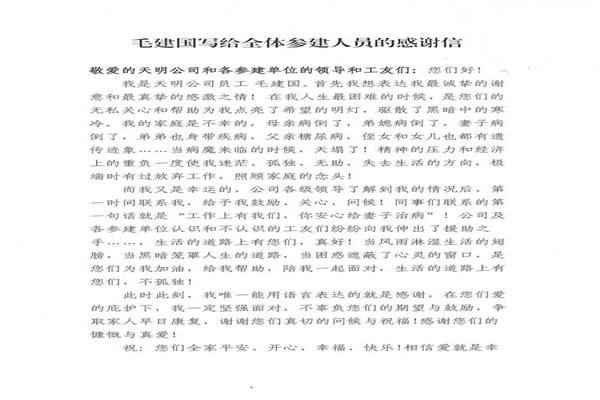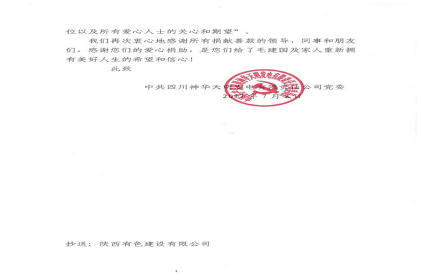 信中指出,神華天明發(fā)電公司員工毛建國家人長期患病,妻子又突發(fā)嚴(yán)重的心臟病,讓原本不富裕的家庭更是雪上加霜。在了解到相關(guān)情況后,神華天明項目部負責(zé)人高度重視,積極開展愛心捐款活動,為毛建國一家伸出了援助之手,幫助其度過難關(guān)。