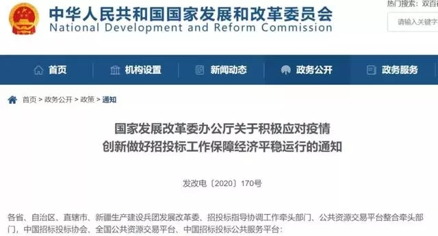 2月8日,國家發(fā)改委辦公廳發(fā)布《關(guān)于積極應對疫情創(chuàng)新做好招投標工作保障經(jīng)濟平穩(wěn)運行的通知》,對有序開展招投標等公共資源交易活動、保障經(jīng)濟平穩(wěn)運行提出13條要求。
